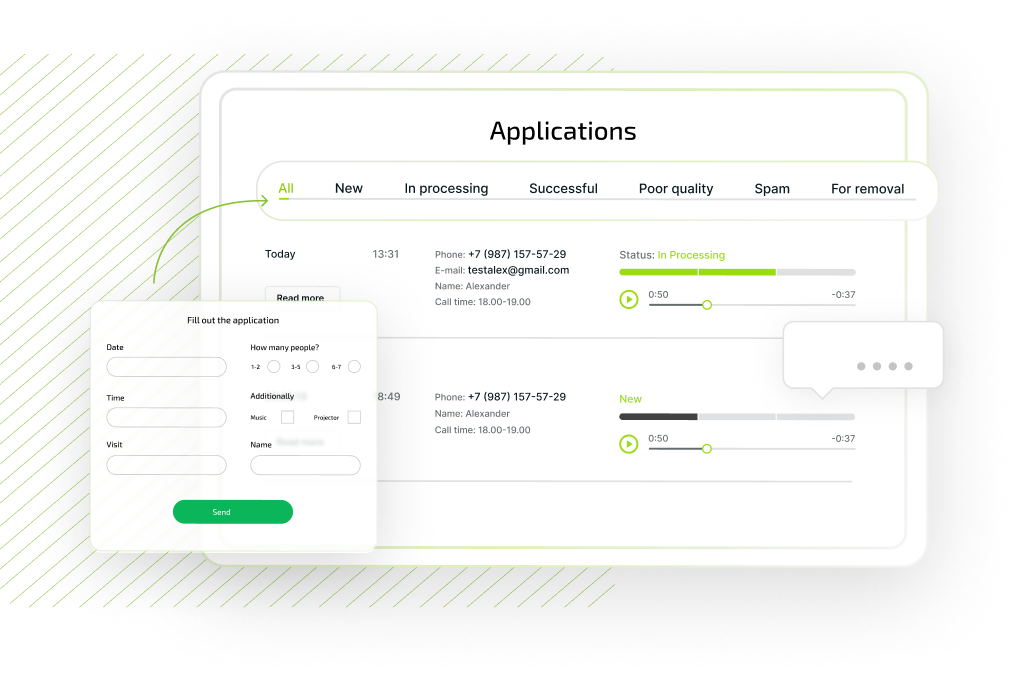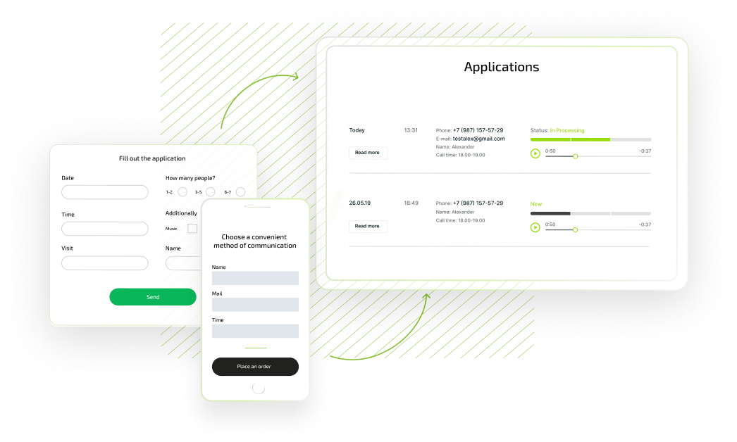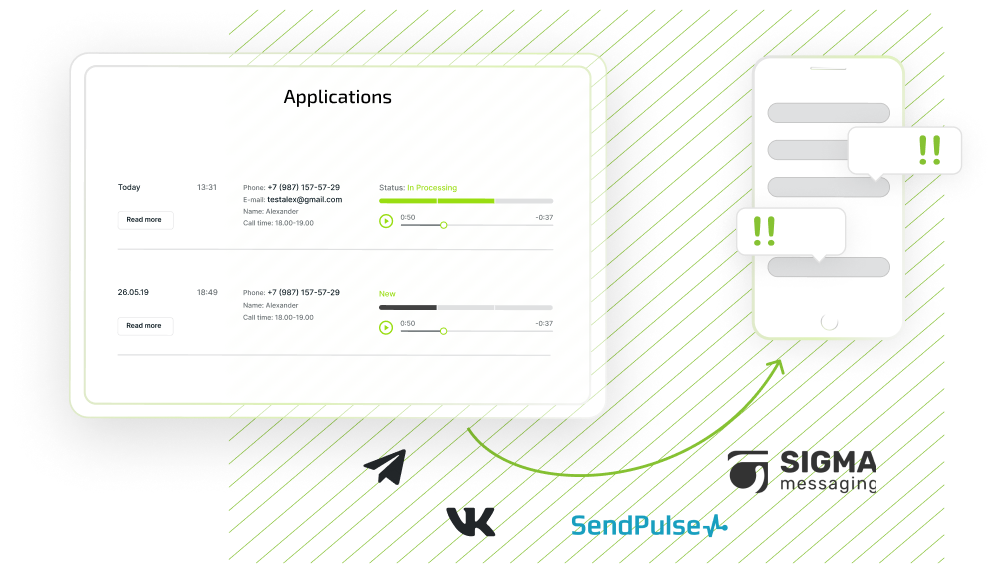 Configure sending data to messengers, social networks, SMS and email mailing services to receive notifications about applications in real time