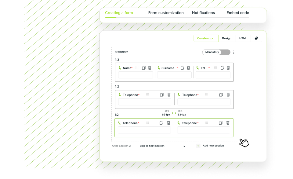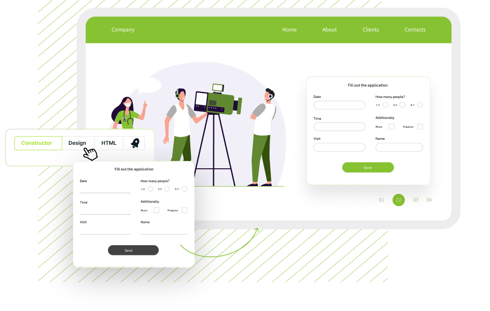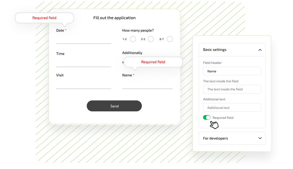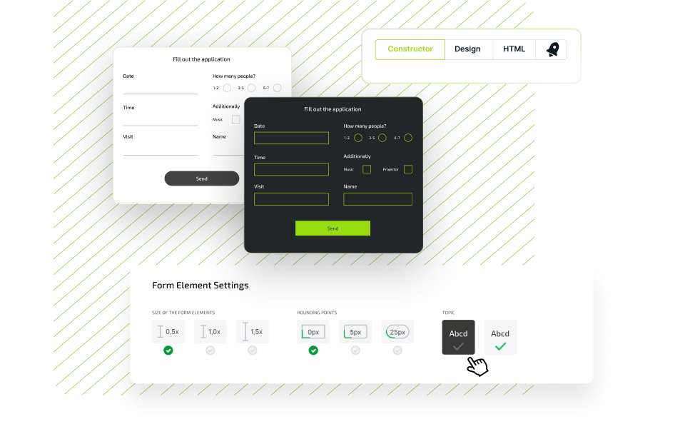 Choose one of the design themes and set parameters for the rounding of the fields, the color of the buttons and the location of the elements. Customize the frames, color, background and other parameters according to the corporate identity of the site