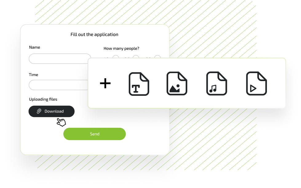 Create forms with the ability to upload text files, music, images, videos. Work with customer files inside QForm or send them to a convenient location