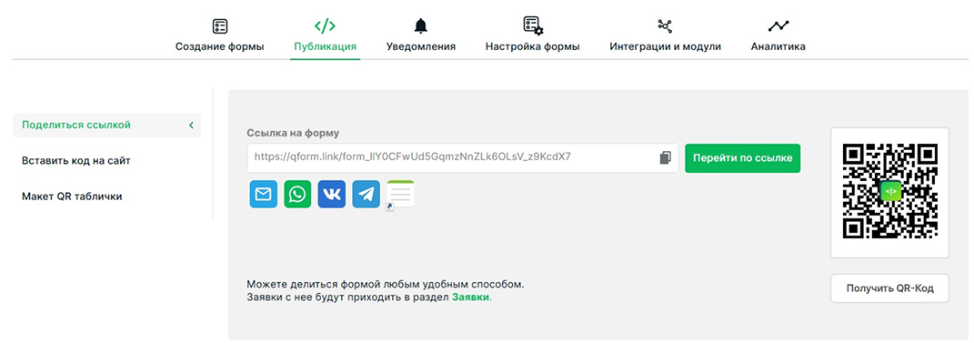 - Publishing a form without a website (optional). If you don’t yet have a website or want to share the form separately (e.g., in social media), QForm offers a convenient solution – the QForm.link service. Every created survey or form can be published on a unique QForm webpage with your content. Simply copy the link (URL) to this page and share it with your audience – in messengers, emails, forums, etc. Users will be able to access the link and fill out the form as if it were part of your website. All submitted data will still appear in your QForm CRM. Sharing forms via a link is useful for quick surveys, testing, or cases when your site is still under development.
