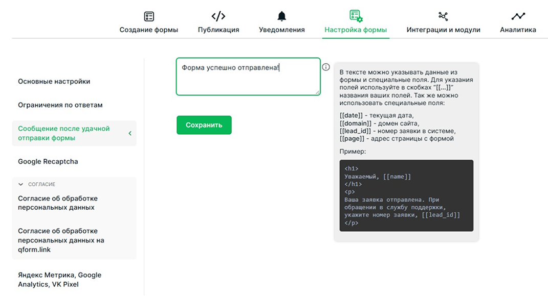 - Security and compliance. QForm pays special attention to data security. The service makes it easy to comply with data protection regulations: you can add a consent checkbox for processing personal data and configure the display of your privacy policy. Additionally, QForm includes anti-spam measures such as Google reCAPTCHA integration and its own filtering mechanisms for unwanted submissions. This ensures a clean request database and legal compliance when collecting information.